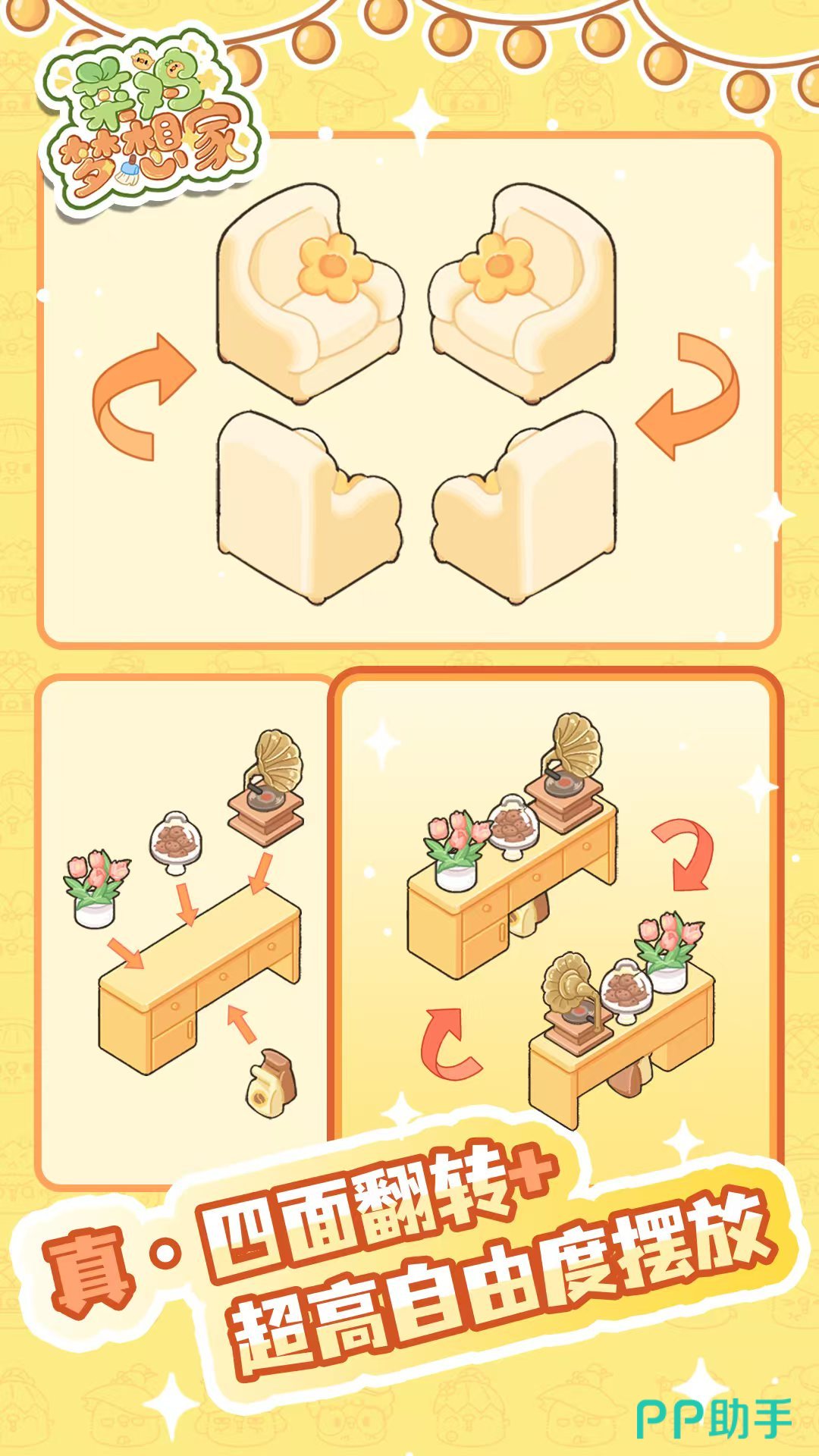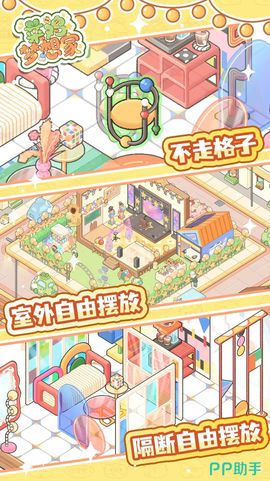 作为一款中度模拟类作品,《菜鸡梦想家》以房屋装修与空间营造为核心玩法之一。区别于传统格子制布局,本作采用无网格四向翻转系统:家具可自由摆放在室内任意角度,亦能直接延展至户外空地;更支持移除墙体结构,在地基层面上进行开放式布景,极大拓展了创意表达边界。