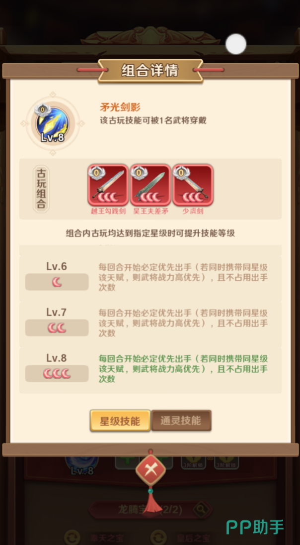矛光剑影:它是由越王勾践剑,吴王夫差矛,以及少虡剑,作为开荒时期必抽。先手优势能够大幅度的提升,而他作为先手控制流,每回合必定优先出手,并且不占用出手的次数。目前在多个场景当中能够合理的运用,比如在竞技场或者是在巅峰对决等等,先手优势的pvp场景当中,他会发挥着重要的实力,并且能够打乱敌人的节奏感。