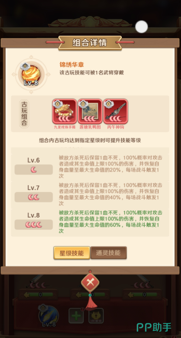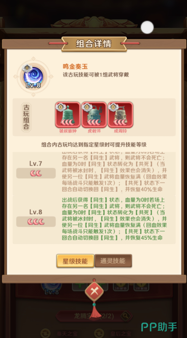 鸣金奏玉:由虢叔旅钟、虎戟镈、成周铃组成,作为生存续航流,它比较适合高难度的副本,或者是玩家直接去参加跨服战斗,目前是需要持久战的。众多场景当中,对于玩家来说,这个古玩适合中后期,它有效的能够提升队伍的容错率,目前适用的场景比较多,它能够有效的保护核心的输出或者是辅助,避免被集火秒杀。对于这个流派,出战之后将会获得重生的状态,一旦一名武将的血量直接为零之后,如果说战场上还有同生的武将,则自身不死病。并且另外一名同生的武将血量将会回满。