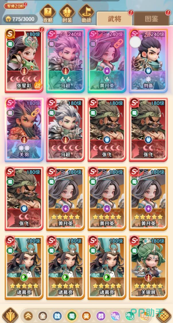 在面对接下来的阵容当中,其实玩家发现在整个游戏中涉及到四大阵容,分别是蜀国阵容,他们能够实现追击秒杀,还能够残血收割。比如这里选择的核心武将是关羽,赵云,诸葛亮、黄月英,张飞、刘备。目前整个阵容比较适合pvp的快速击杀,在pve推图方面能够负责收割。