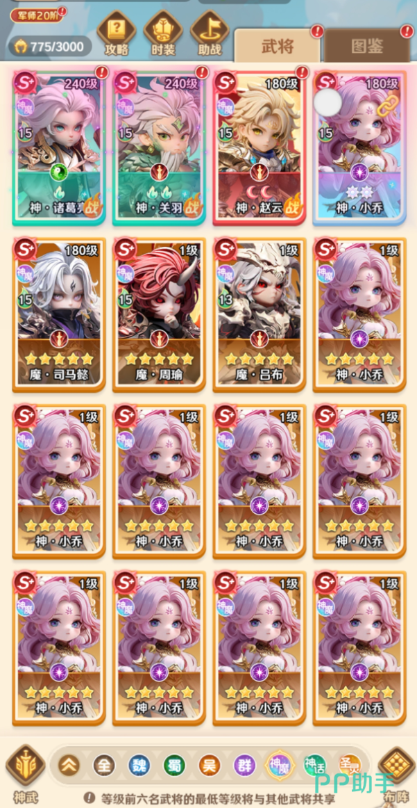其实在巨神军师游戏当中,还有一个神魔混搭的阵容,这个阵容相对来说是比较强悍的,也具备一定的全能性。在这里选择的武将是关羽、吕布,诸葛亮,小乔,貂蝉,吕玲绮。这些角色直接搭配在一起,就比如说魔性的吕布,他的伤害要比普通的吕布高很多,关羽还是负责收割,这样就能够形成双核的爆发体系。诸葛亮能够提供怒气值,小乔跟貂蝉可以强化控制跟护盾的容错率。
