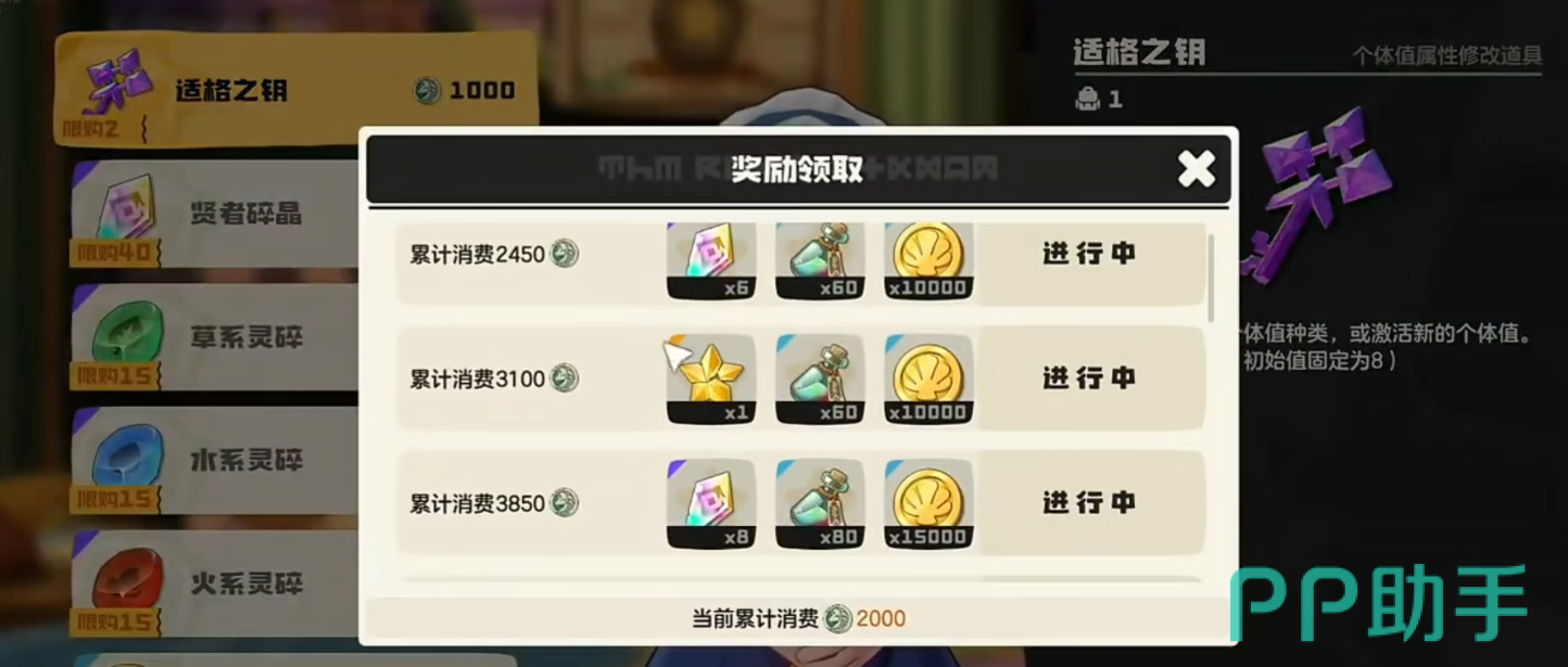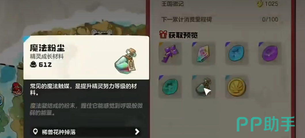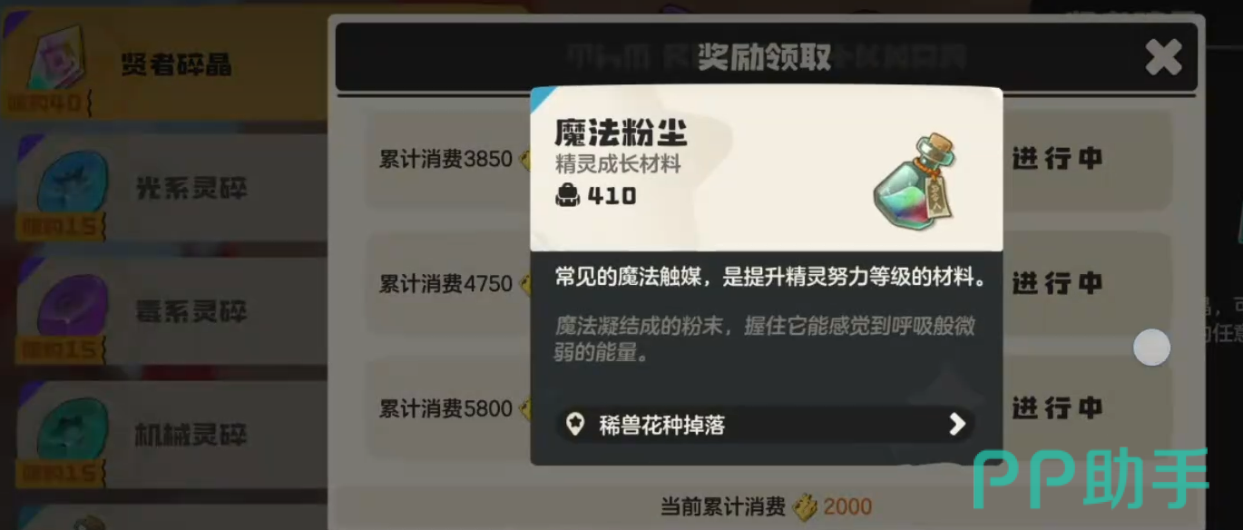 王国城堡附近还有一个精灵道具店。这个位置稍微远一点,不过也不难找。从地图上看王国城堡的区域,周边会标注有精灵道具店的图标。这个店同样设置了消费里程碑奖励,机制和前面两个店是一样的。累计消费到了就能领,里面的魔法粉尘数量也够用。