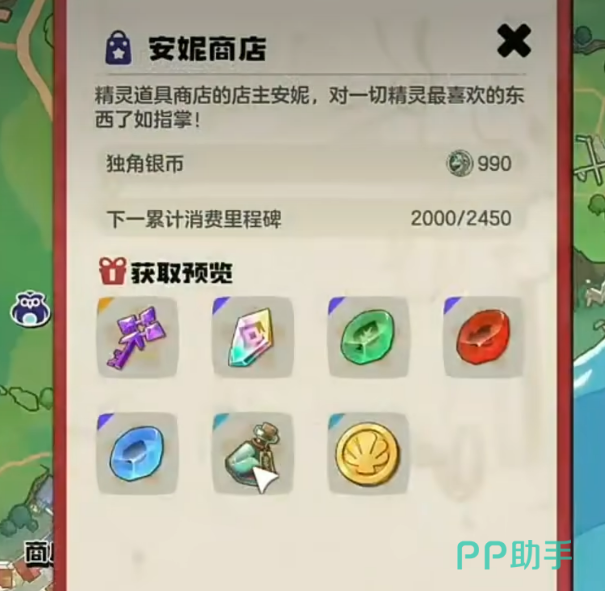 然后是彼得大道那边,这里也有个精灵道具店。具体位置在彼得大道区域,打开地图就能找到。这个店铺的模式和安妮商店差不多,同样有消费里程碑这个设定。完成了对应的消费额度就可以领取奖励,粉尘自然也包含在内。而且这个店里直接购买魔法粉尘的价格也还算合理,急用的时候可以直接买一波。
