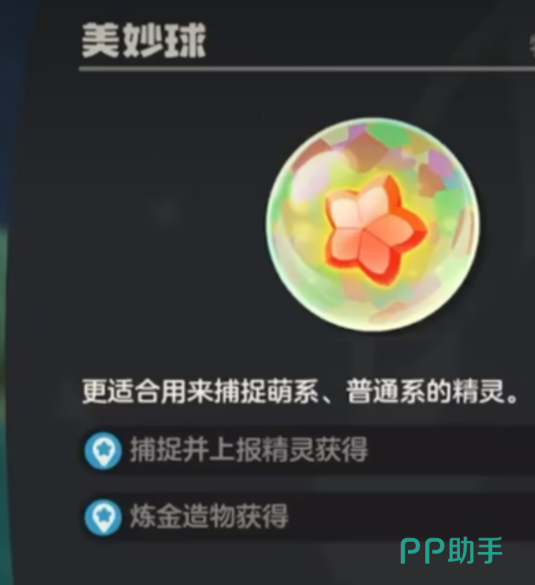 最后一类就是属性球了,这个可以在炼金台用两个普通球合成出来,一共有多种不同的类型。瞌睡球整个是紫色的,中间镶了个月牙形状的石头,专门用来抓睡着状态的精灵。美妙球看起来透明的,抓萌系和普通系精灵特别好用。好战球是血红色的球体,外面还长了些尖刺出来,适合抓火系跟龙系的精灵。光合球是绿色的,球上的石头冒出了嫩芽和小花,用来抓草系和冰系精灵效果不错。