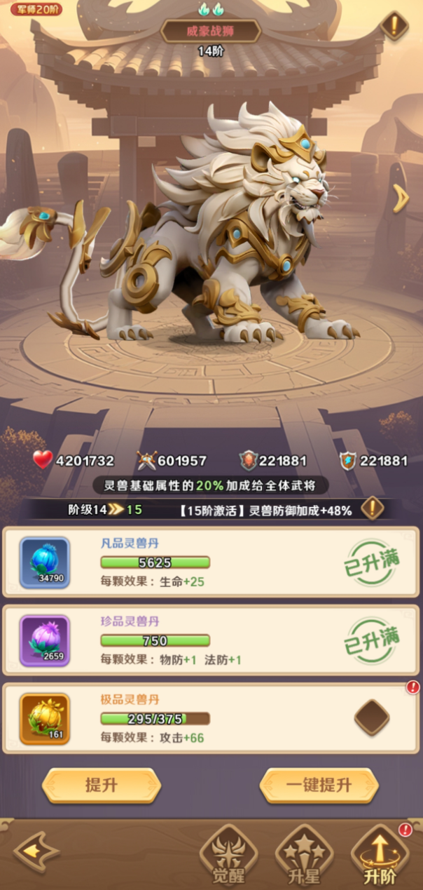 豪威战狮:定位为前期主力输出型灵兽,具备显著的团队增益能力。其核心机制在于技能释放后,可为全体武将提供怒气值补充,同时提升全队伤害、暴击率与暴击伤害三项关键属性。该灵兽无需依赖复杂操作即可快速融入主流阵容,在主线推图与精英副本中表现稳定。建议优先将其升至6星,以解锁被动技能,最大化团队输出循环效率。