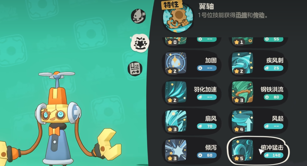该精灵在对战中的职能定位清晰:依托九种细别相性的抗性覆盖实现稳定站场,并通过特性“翼轴”强化1号位技能——赋予其迅捷与“传动”双重效果。“传动”指技能在回合结束时自动顺延至下一位置,导致技能栏动态轮转,因此实战中必须预判技能位移路径,否则极易打乱节奏。辅助技“轴承支撑”置于2号位最为合理,既可保障减费稳定性,又能避免因传动干扰关键输出技能的释放窗口;该技能生效后,相邻技能消耗降低50%,主动触发时更可直接削减2点PP值,大幅提升技能链运转效率。
