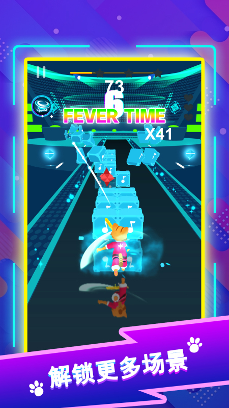 本作突破传统下落式音游范式,将跑酷机制与击剑动作系统深度融合。玩家操控拟人化猫咪角色,在光影流动的立体赛道中高速行进;音符以几何方块形态呈现,需结合节奏点位完成横斩、纵劈、格挡等剑技操作,实现动作精度与节拍准确度的双重考核。