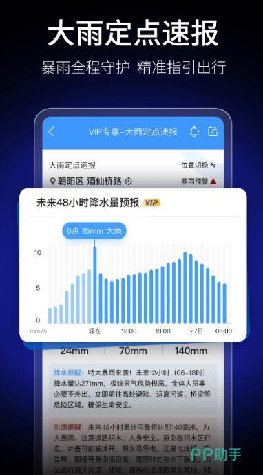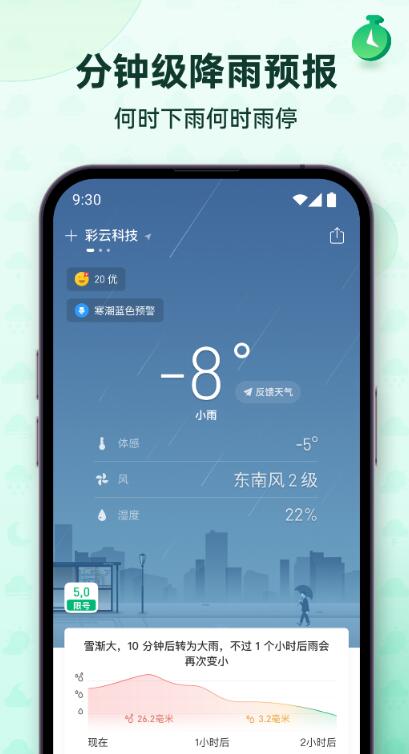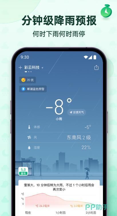 彩云天气最大的亮点在于,它能利用人工智能分析气象雷达图,提供未来两小时内的精准分钟级别降水预报,同时,它实现了街道级的天气定位,能为不同街区提供专属预报,有效解决了不同街道天气不一样的预报难题。