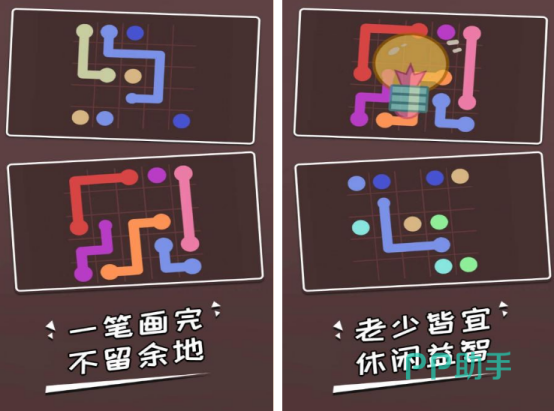 基于传统一笔画原理设计,玩家需用单一线条连接所有同色圆点,且不可重复经过同一格子。完成填满即通关,过程需统筹全局路径,避免死路。规则简洁但解法多样,儿童可借此提升图形感知与逻辑推理能力,成人亦能享受解谜成就感,属于典型的低门槛高耐玩型益智产品。