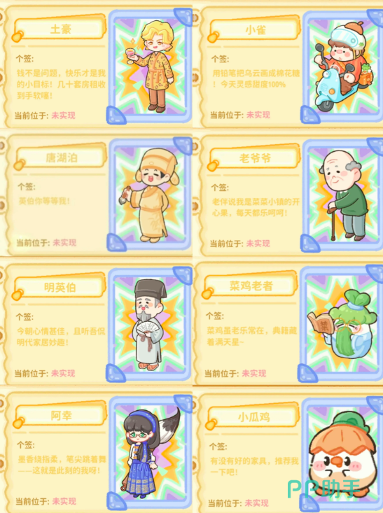 当玩家等级提升并解锁“品质社区”公寓后,将新增7位NPC:土豪、唐湖泊、老爷爷、明英伯、菜鸡老者、阿幸、小瓜鸡。该区域NPC侧重中后期资源转化与支线伏笔铺设,部分角色会提供限时挑战任务或隐藏成就触发条件。