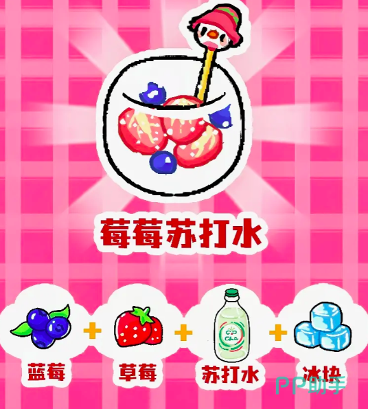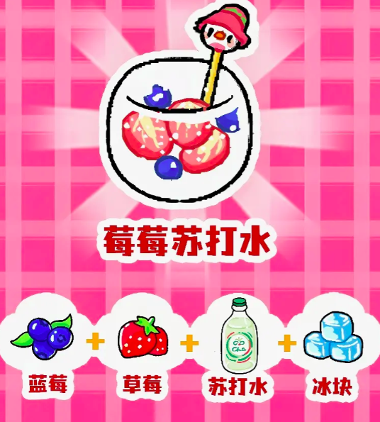 第一款:草莓苏打水。所需材料为蓝莓、草莓、苏打水、冰块,完成后需搭配小鸡仔吸管装饰件。成饮呈现柔和粉色调,视觉清新,是新手入门首选。摇晃方式须严格按前述S型路径执行。
