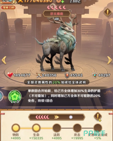 进入中期(队伍基础成型阶段),灵兽配置需转向功能互补性。此阶段重点解决阵容短板问题:玄鹿与麋鹿类生存向灵兽可显著提升团队容错,其复活或护盾技能在挑战高难度BOSS及竞技场对抗中往往成为翻盘关键;玄鹿的闪现拉人机制,能在己方武将即将被秒杀瞬间将其拽回安全位置并触发治疗,实现战术级保人;黄金兽则兼具威慑与增益双重特性——降低敌方输出的同时提升自身攻击力,使其既能融入高速功能流体系,亦可支撑爆发输出流派,适配性极广。