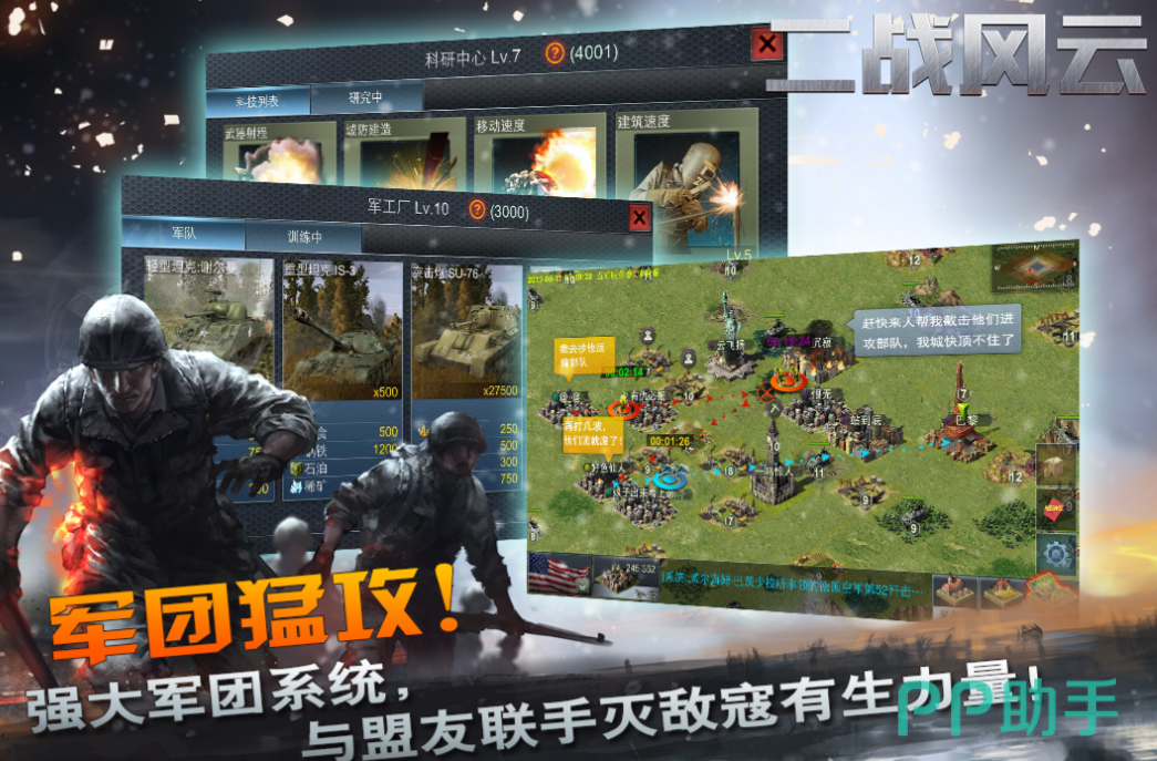 作为国内早期3D战争策略手游代表作,《二战风云》采用自研引擎构建高拟真战场环境。地图覆盖东线、西线、北非三大战区,地形细节包含雪原、丘陵、城市废墟等12类地貌;兵种体系严格对标1939–1945年实际编制,含伞兵、工兵、反坦克炮等32种可训练单位。玩法上整合军团组建、科技树研发、防御工事建造、资源采集与跨服领土争夺,支持百人同图实时对抗。其成熟稳定的策略生态与长线运营机制,使其成为军事策略品类中具有标杆意义的作品。