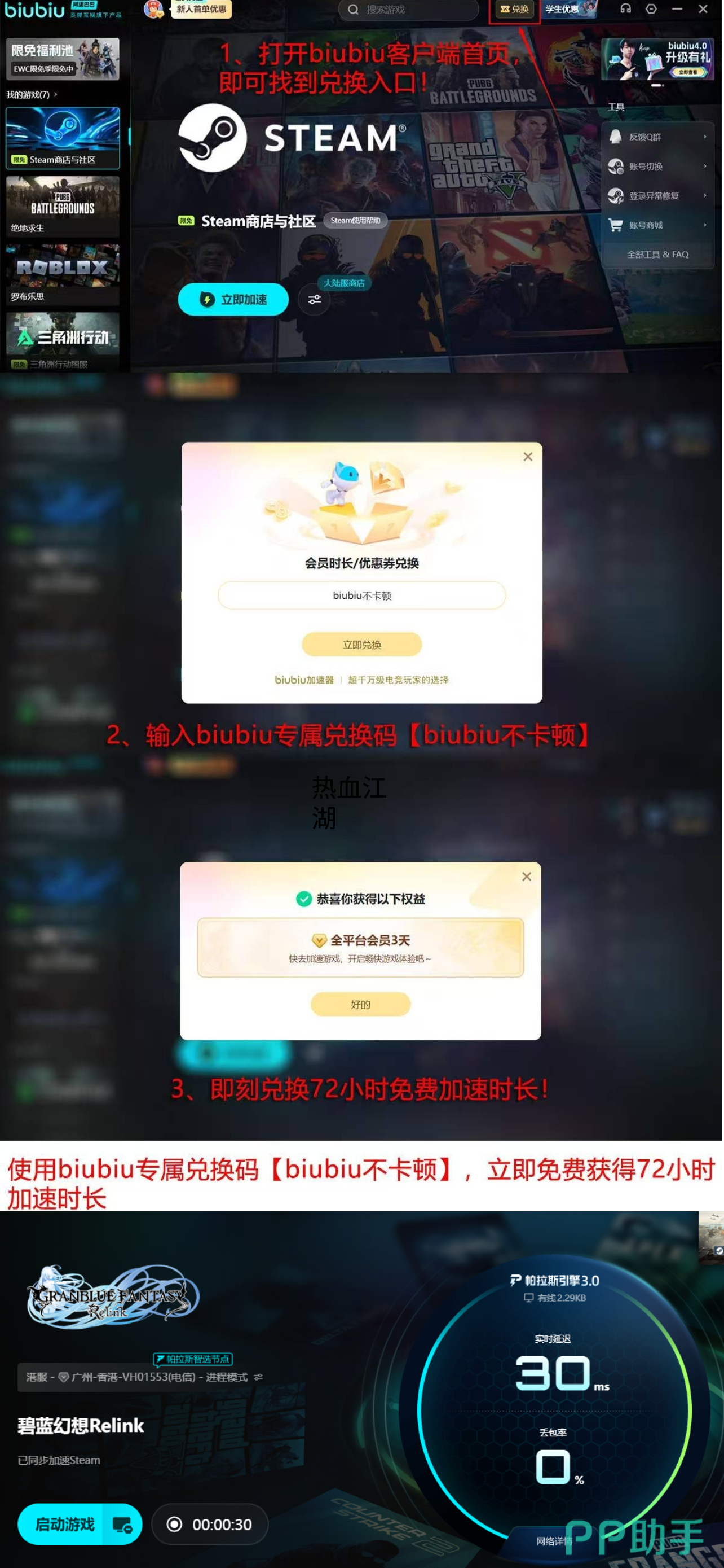 新用户注册即享多重体验权益:输入福利码【biubiu不卡顿】可立即激活3天全功能使用权;首次完成账号绑定后,系统额外赠送24小时加速时长,两项叠加总计可达96小时免费体验期,全程无需付费,便于充分验证实际优化效果后再决定是否续订。