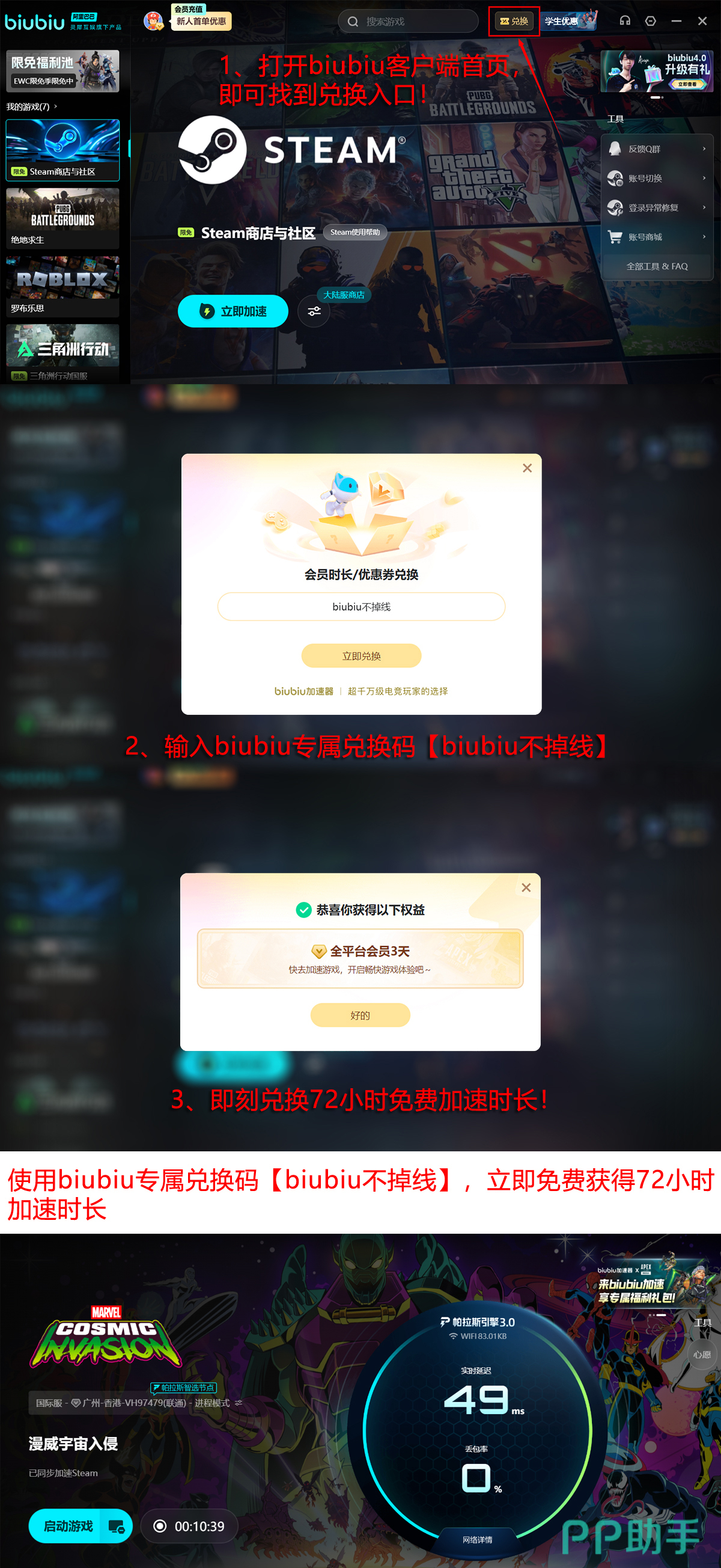 biubiu加速器面向新用户提供多项权益:注册即赠24小时免费服务时长;首页同步开放兑换活动,输入口令【biubiu不掉线】可额外领取72小时服务时间,累计达96小时。