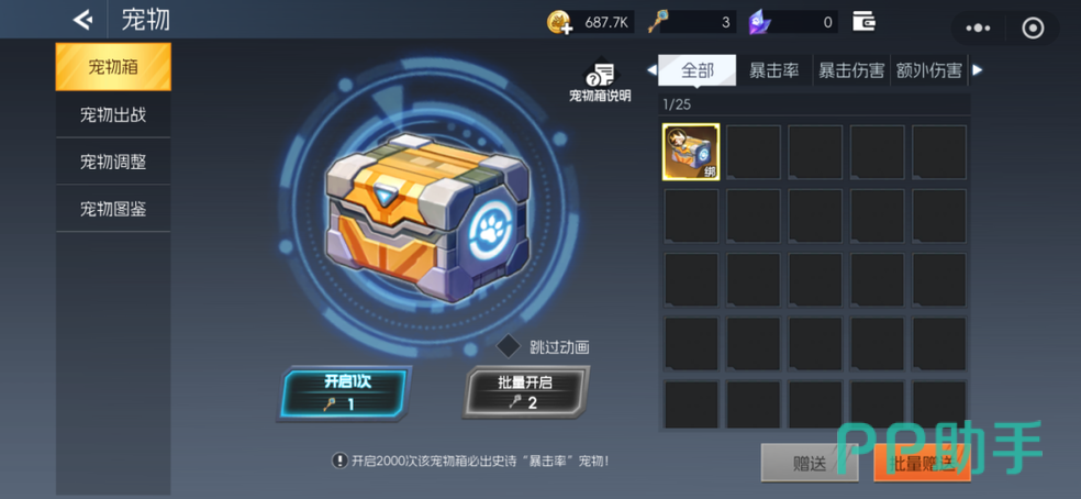 除基因改造外,宠物系统构成另一条重要战力成长线。玩家可通过开启宠物宝箱获取不同稀有度与属性倾向的伙伴,部分限定词条宝箱可确保产出指定属性类型的宠物。宠物分为出战与助战两类:出战宠物提供主属性200%加成及重点属性额外增益;助战宠物则激活基础属性,不参与战斗但持续生效。未被使用的宠物可分解为精魄,用于拓展更多助战位,实现资源循环利用。