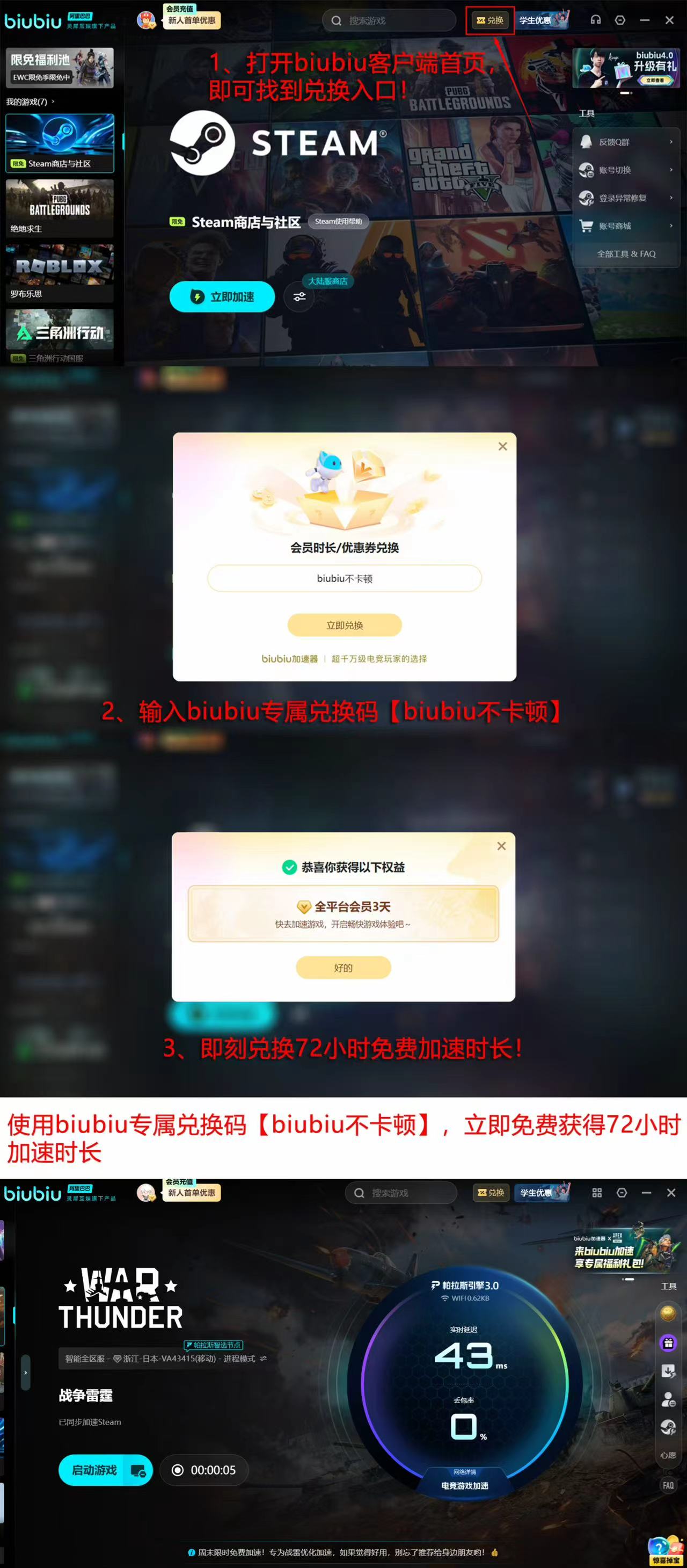 为降低体验门槛,biubiu面向新用户开放双重福利机制:注册即赠24小时全游戏通用加速时长;另提供专属兑换码【biubiu不卡顿】,可额外激活3天连续使用权限。两项权益叠加,新用户最高可获得总计96小时的完整试用周期,充分验证其在《战争雷霆》中的实际效能。