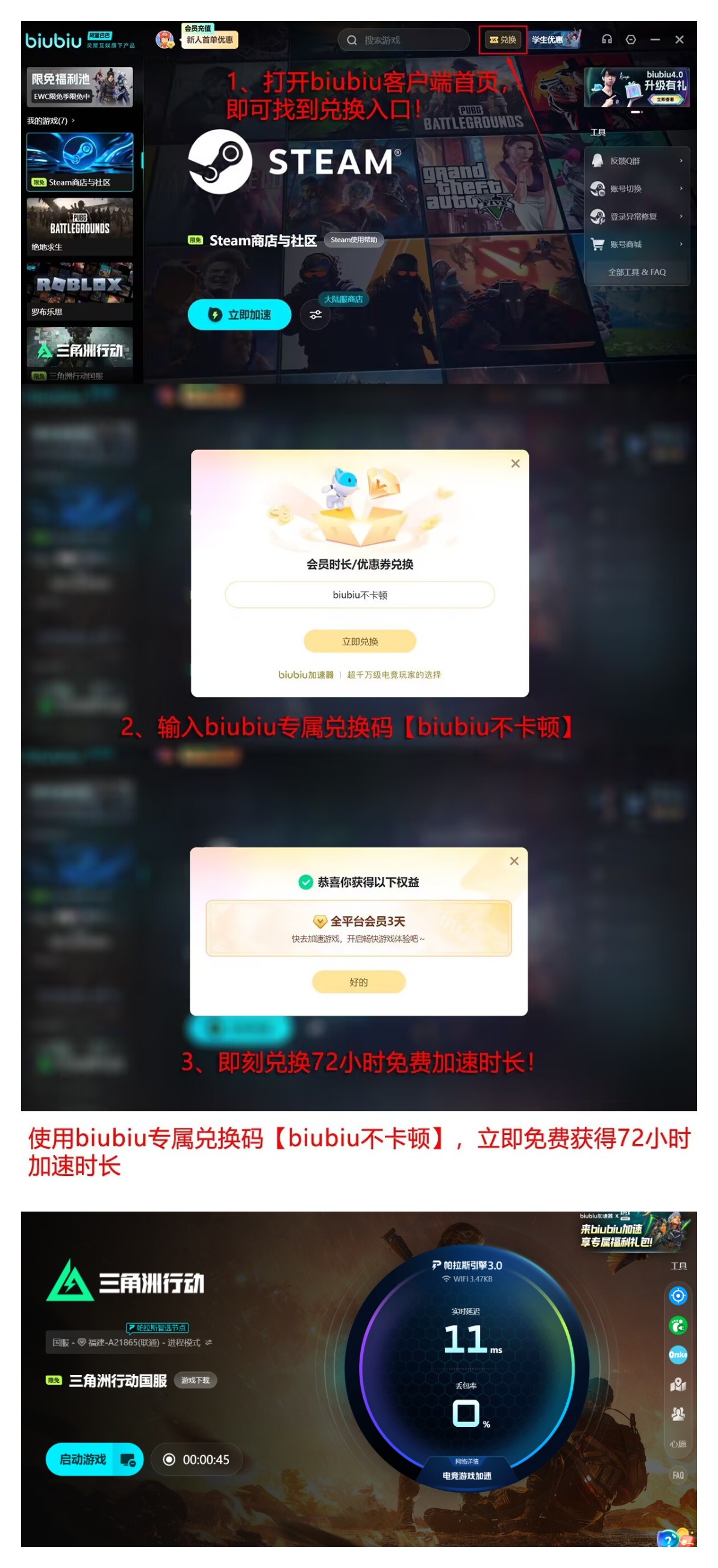 目前,biubiu加速器正面向全体用户推出限时福利活动:新注册用户可立即获赠1天免费使用时长;所有用户(含老用户)输入兑换码【biubiu不卡顿】,即可额外领取3天加速服务。综合计算,新用户完成注册后最高可累计获得96小时无限制加速权限,覆盖多日连续作战需求,切实缓解对枪卡顿、撤离掉线等高频痛点。