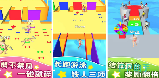 清新又靓丽的游戏画风,还有多种不同的运动方式,有的是以奔跑或者是健身为主,有的是以冲撞敌人为主要核心。大家可选择自己喜欢的挑战模式参与比赛,比如有铁人三项,在每个赛道当中都会有不同的道具等大家来收集,从而提升自己的肌肉。就比如在同一个比赛场景当中,将会呈现出各种各样的敌人,利用自己高大的体格以及魁梧的身材使劲冲撞对手,让对方的肌肉流失,增强自己的实力。