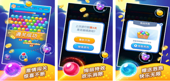 精心设计的关卡内容应有尽有,每个关卡中都有具体的分数要求,比如刚开始第1关可能只要分数达到1000分即可完成通关,随着关卡的升级之后,目标分数也会有所增加。点击游戏开始后,屏幕上方会不断缓缓涌现出各种颜色的泡泡组合而成,屏幕下方又会随机弹出不同颜色的球球,通过精准瞄准以及物理弹射的方式,将相同颜色的泡泡挨在一起即可快速消除,还可看到绚丽特效,让你欢乐消除。
