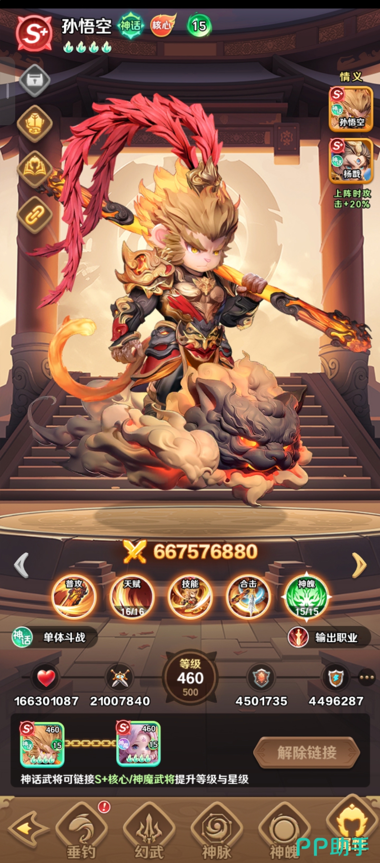孙悟空以极致爆发见长,拥有全神魔序列中罕见的开场瞬发技能机制。天赋加成后暴击伤害显著提升,确保首回合即打出高额压制伤害;当自身血量低于50%时,将额外发动追加攻击,配合其高机动性与收割判定,在残局阶段可快速终结敌方关键单位,打破僵持局面。