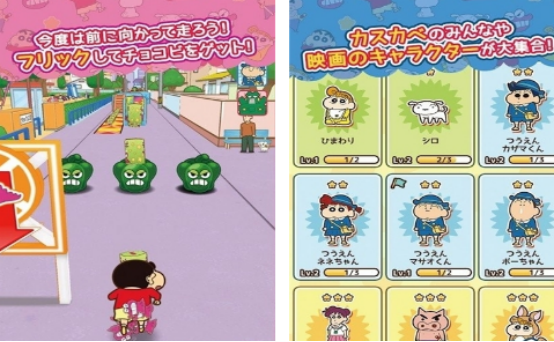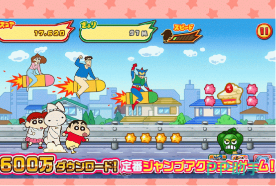 同样是根据经典的蜡笔小新动画片所打造而来,由日本公司所发行的,所以里面的文字也是以日文为主。大家仿佛进入到了动画片中的世界一样,看到蜡笔小新的父母,甚至是他身边的各种朋友。大家在游戏时会面对很多的危险,通过不断躲避沿途当中的一些障碍,或者是骑着火箭等,更有机会获得相应的奖励,带来趣味性。