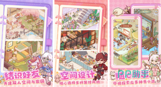 佛系蜗居生活为核心,主打治愈系慢节奏生活体验,可享受属于你的自由休闲时光,支持室内外装修,可选择北欧复古等不同的特色主题,风格和模式,角色与宠物进行自由互动,也可与宠物搭配同款服饰,打造成为亲子装。最初仅是单机模式,当前推送出联机版本双人建造,共同打造双人家园。
