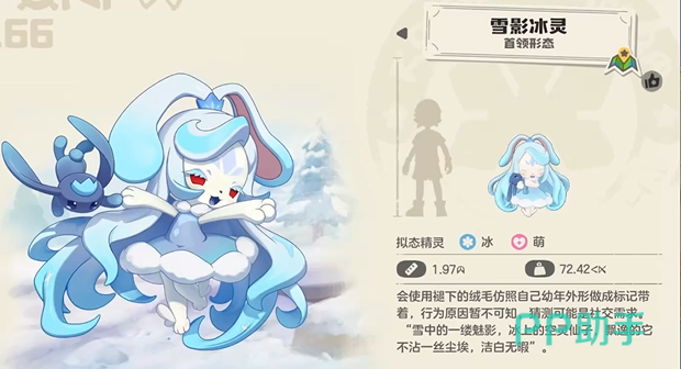 雪影娃娃为二段进化链中的中间形态,由初始形态“大耳帽兜”进化而来,属性为纯冰系。其最终进化形态为“雪影冰灵”,触发条件为角色等级达到100级。该等级门槛虽高,但无需额外道具、特殊场景或特定时间,满足等级后即自动完成进化,流程高度稳定,无隐藏限制。