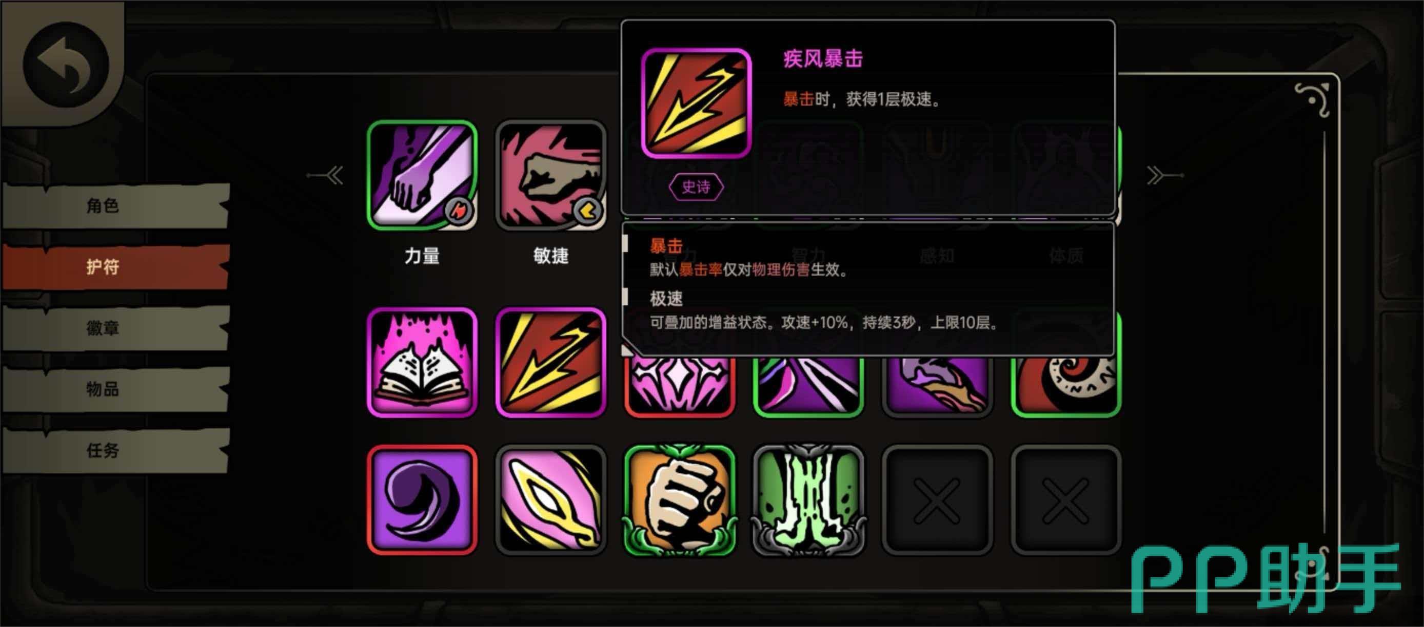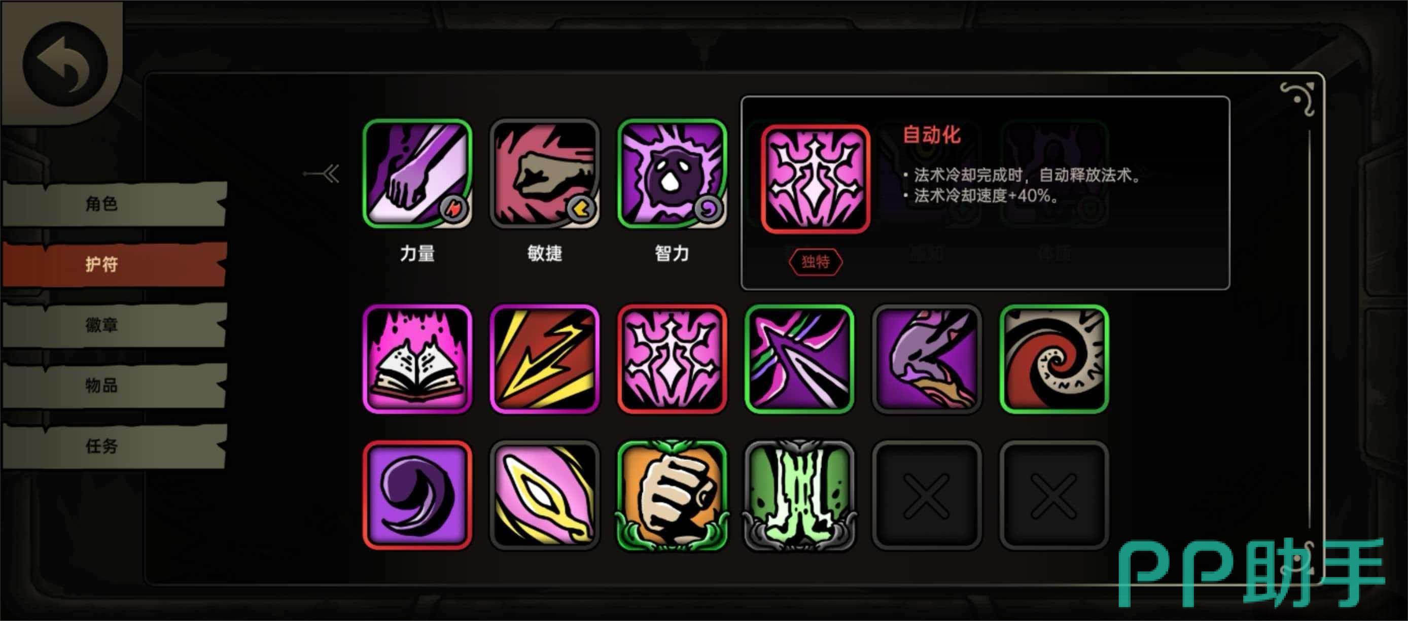 另一关键护符【自动化】提供主动法术自动施放功能,解放操作负担;其附带的“所有BUFF类法术冷却缩减40%”特效,显著提升毒素技能释放频率,使中毒层数堆叠效率倍增,从而加快整体伤害节奏,是维持稳定毒压的核心支撑。