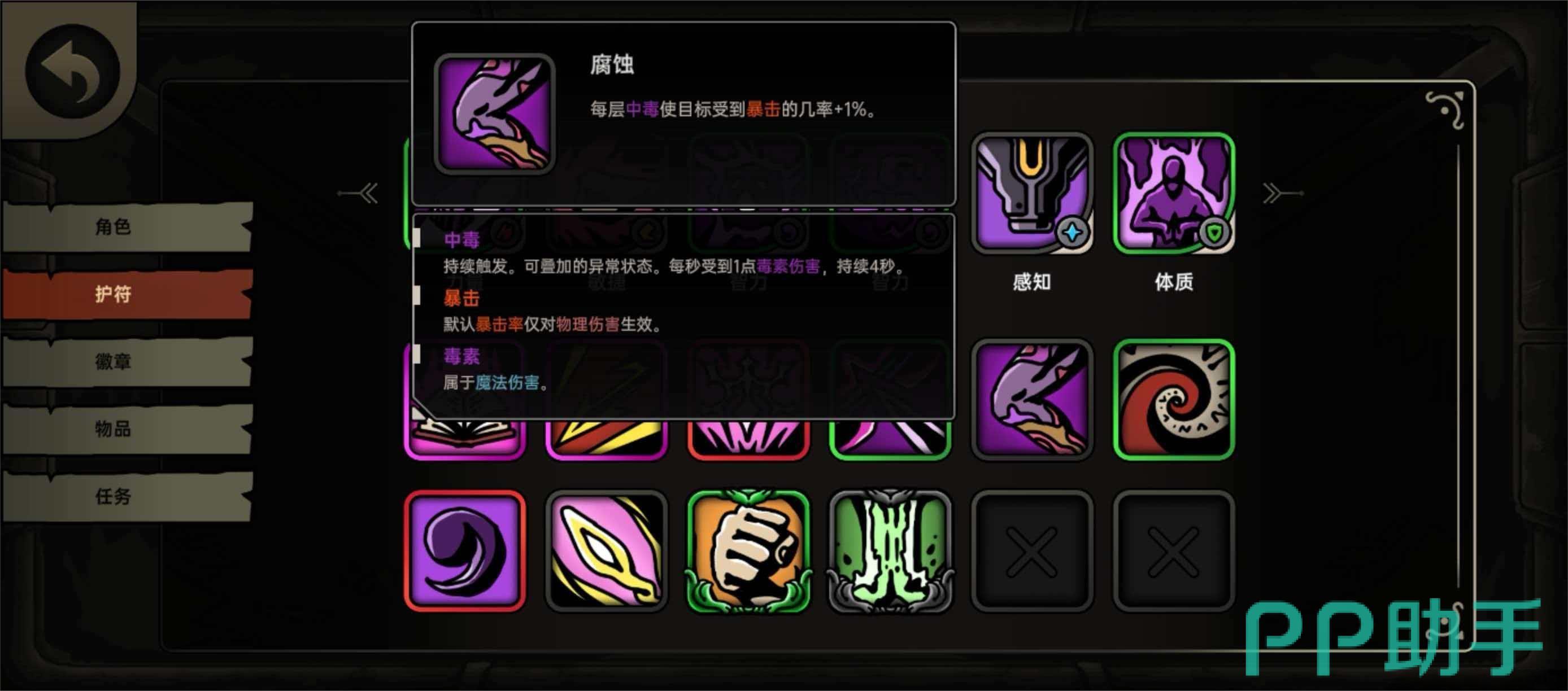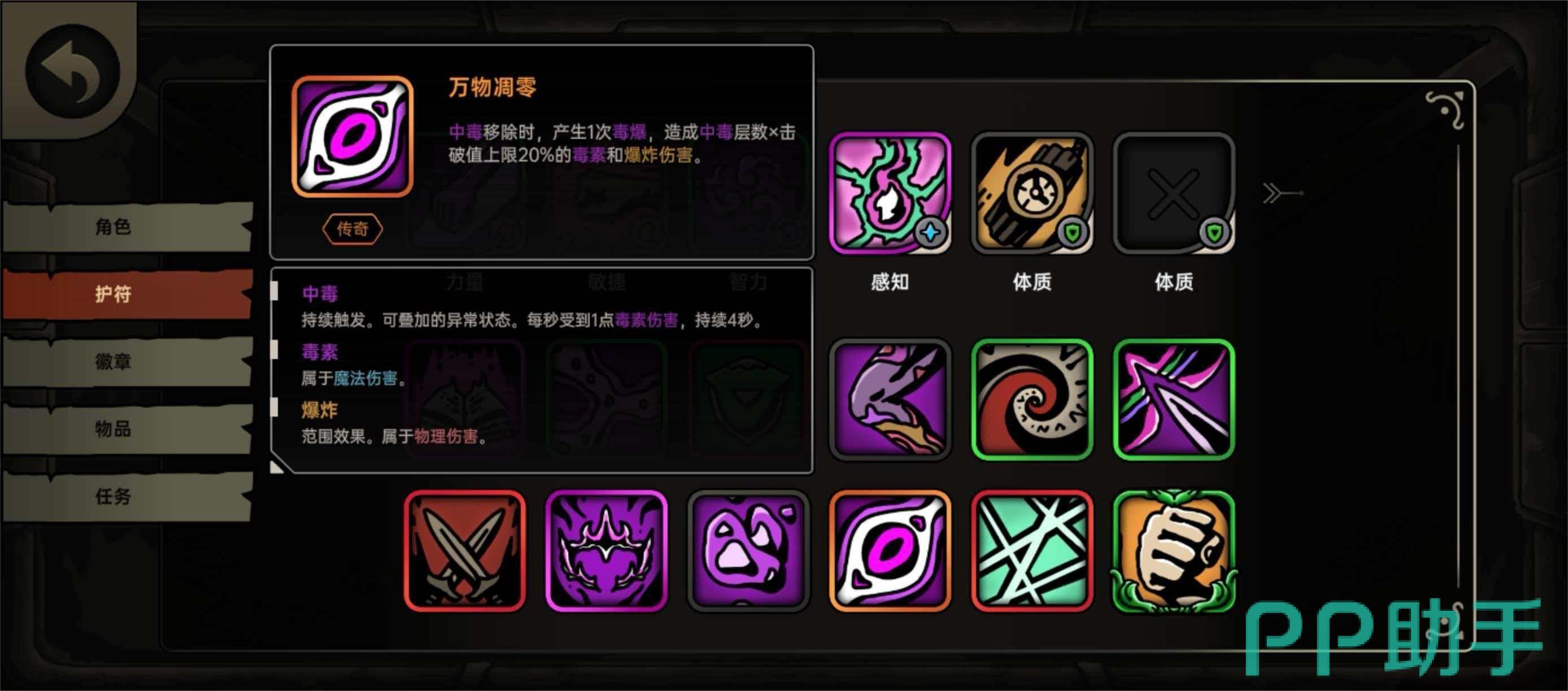 核心配装首选传奇护符【万物凋零】——该效果在目标中毒状态被清除时强制触发一次毒爆,其伤害量同步受当前中毒层数与击破数值双重加成,并可与基础毒液伤害完全叠加,形成短时间内的高强度毒伤峰值,在应对高机动或高减伤目标时尤为高效。