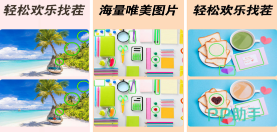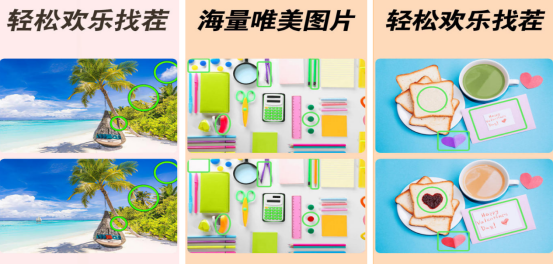 经久不衰的找茬元素,以及精心设计8000多个不同的挑战关卡,每个关卡开始之后都会看到上下屏幕有两张极度相似的图片,而这些图片中却有五处不同的地方,必须仔细观察才能够全部寻找出来,更加锻炼大家的眼力以及脑力。其中覆盖的图片类型应有尽有,包括特别梦幻的海滩城市,或者是美食等等。