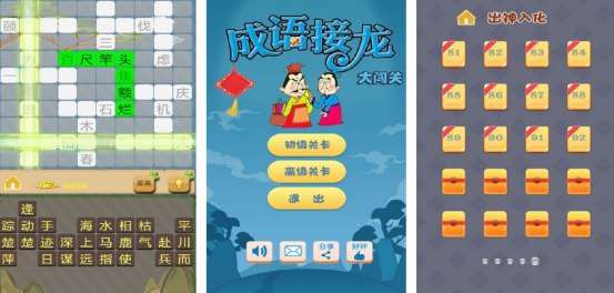 富含的成语知识应有尽有,首先在主屏幕当中将会看到初级关卡或者是高级关卡,大家可根据自己的喜好以及实际情况正确挑选。每个关卡中都有不同的成语组合而成,这些成语可能会纵横交错在一起,但是其中也会丢失1~2个字眼,而大家却需要在下方的单个字体当中正确寻找,只要将正确的成语找到之后就可以完成挑战。
