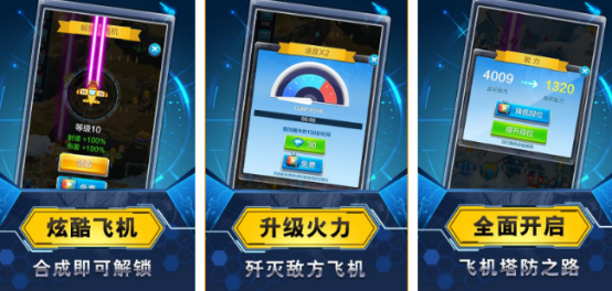 与雷电系列比较相似,同样也以弹幕射击为题材,可以自由挑战大量boss,击败众多boss之后获得超多装备,融合了合成升级、射击、放置挂机等多样化元素,通过合并相同飞机的方式来申请增强火力,有较为完整的策略养成模式,要合理安排飞机阵容,合成更高等级,不断挑战各种敌人,游戏玩法通俗易懂,而且挑战性极高。