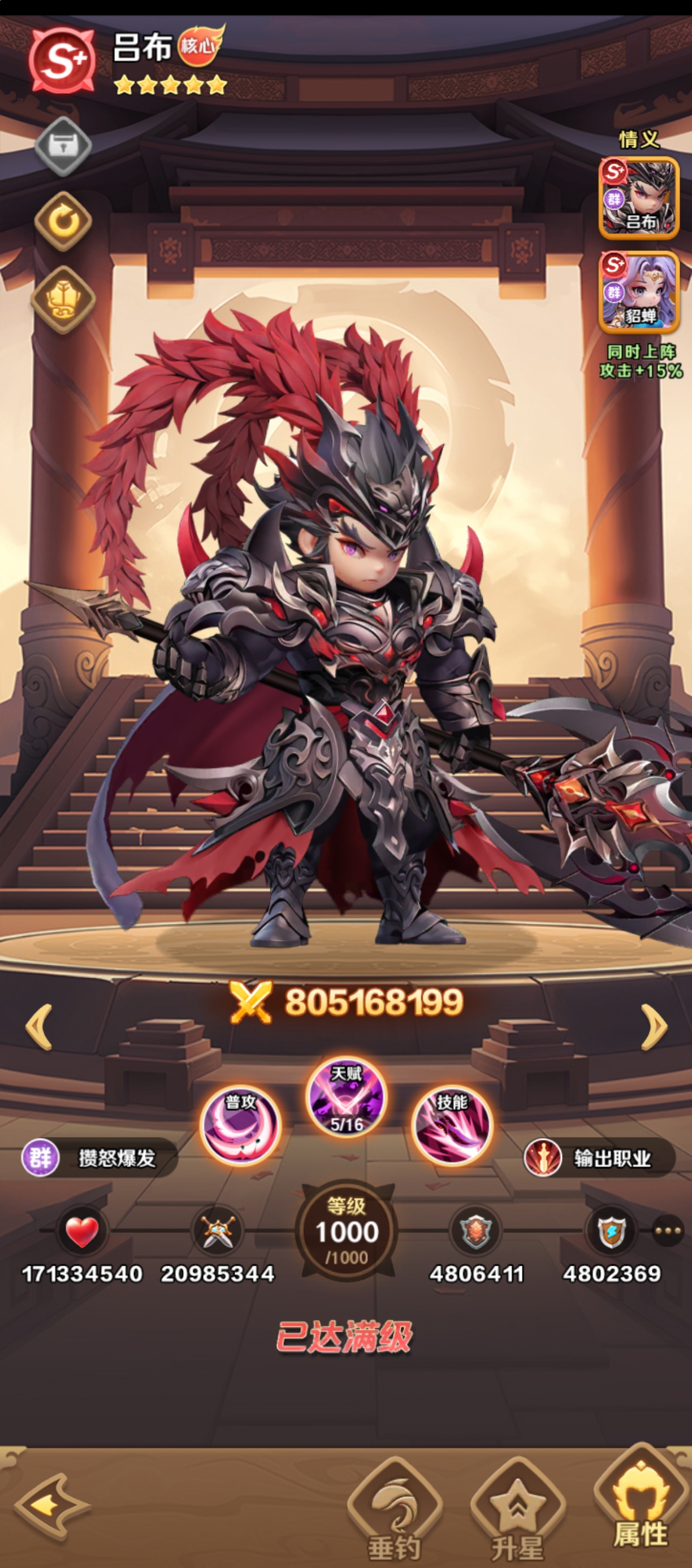 吕布作为后期爆发类型的武将,虽然说吕布在战斗的过程当中,一旦启动的话将会积攒怒气。当他一星之后就可以解锁全员打击的技能,额外还需要搭配高额的伤害加成,一旦在怒气充足的时候,可以实现一键清屏。所以说在后续的阵容当中,吕布绝对是可以作为核心的。