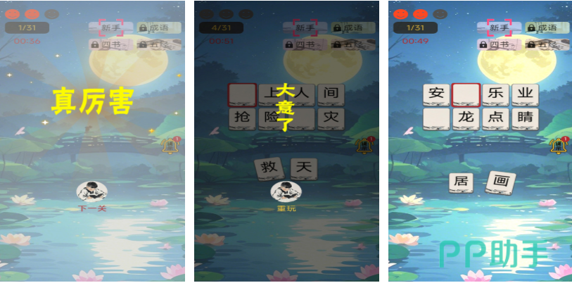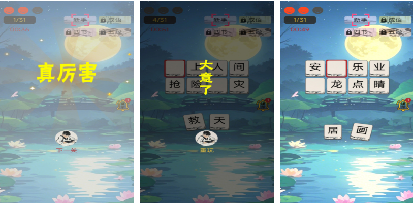 这款诗词歌赋主题的解谜互动游戏也有着超多的玩法,不拘一格的内容跟意境十足的古代气氛都是本作特色,小朋友们可以尝试与不同的诗词歌赋进行互动,点触填写汉字让每一句诗词都完整就是主要任务,荷塘夜色的背景搭配文绉绉的诗词歌赋代入感更强,关卡设定多样而且谜题巧妙很受孩子们喜欢,新手指导也比较良心能轻松了解不少诗词的含义。