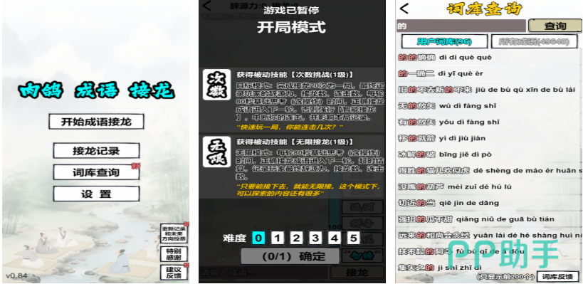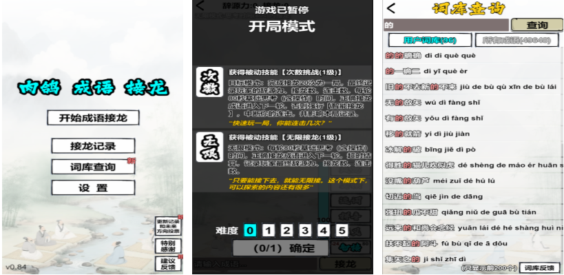 这是款完美融合了肉鸽以及成语知识点的免费学习类游戏,使用肉鸽的方式学习成语的设定还是很罕见的,有着词库调查、成语解谜等超多游戏设定,利用文字肉鸽互动的方式进行解谜更显好玩,肉鸽解谜难度不高但带来的新鲜感绝对无可挑剔,一共上万种不同含义的成语会在这款肉鸽游戏中展现。