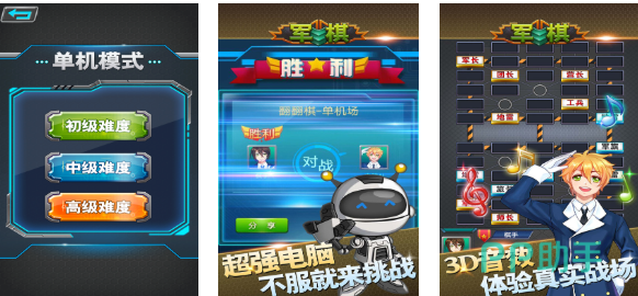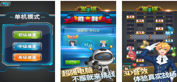 军棋跟象棋类的博弈游戏还是有一定区别的,这款军棋手游有着军旅题材的背景仿佛真实进入战场中,可以实现线上匹配博弈或者单人挑战不同难度的人机,超强的电脑对手会助力大家领悟下军棋的规则,也加入了3D环绕式的特殊音效更给人如临战场的既视感,每一颗棋子全都是用军衔汉字代替的,一目了然就能清楚军队里的军衔大小。