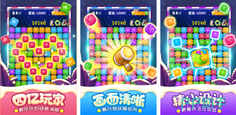 本作是款被精心设计的免费闯关主题的消灭星星游戏,上亿玩家的共同选择也证明了这款APP的硬核程度,画面塑造小清新也有着鲜艳明亮的美术,消除特效熠熠生辉且使用的道具也很全面,关卡设定众多给人提供的消除星星快感源源不断,之所以受到了老年人和手残党玩家的喜欢,是因为这款消除星星的游戏作品操作理念超级简单。