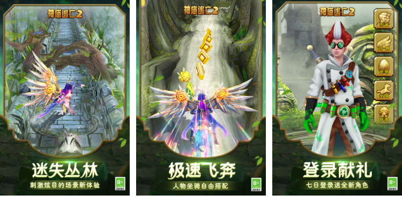 神庙逃亡2这款游戏的大名想必朋友们都知道吧,这款APP继承了第一代的3D跑酷环境和操作机制,但开发了更多的职业和辅助跑酷技能,还融合了翅膀系统会让角色跑酷动作更为绚丽,看着角色快速在神庙地图上飞驰闯关会感觉十分酣畅,可以进行联网并获取更多的签到、任务奖励,爱玩逃生模拟游戏的朋友可以尝试神庙逃亡2!