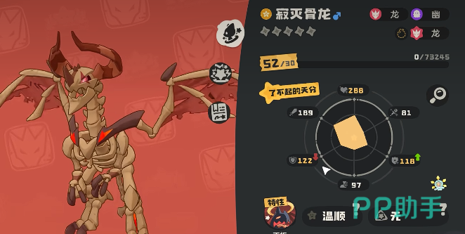 特性层面,大头骨龙独占“不朽”这一不可替代的专属机制——全游戏中唯一具备战斗中复活能力的特性。需注意的是,其复活触发存在六回合冷却限制,因此该效果主要服务于多精灵接力战术体系,在单体持久战中无法频繁启用,属于典型的战略型增益配置。