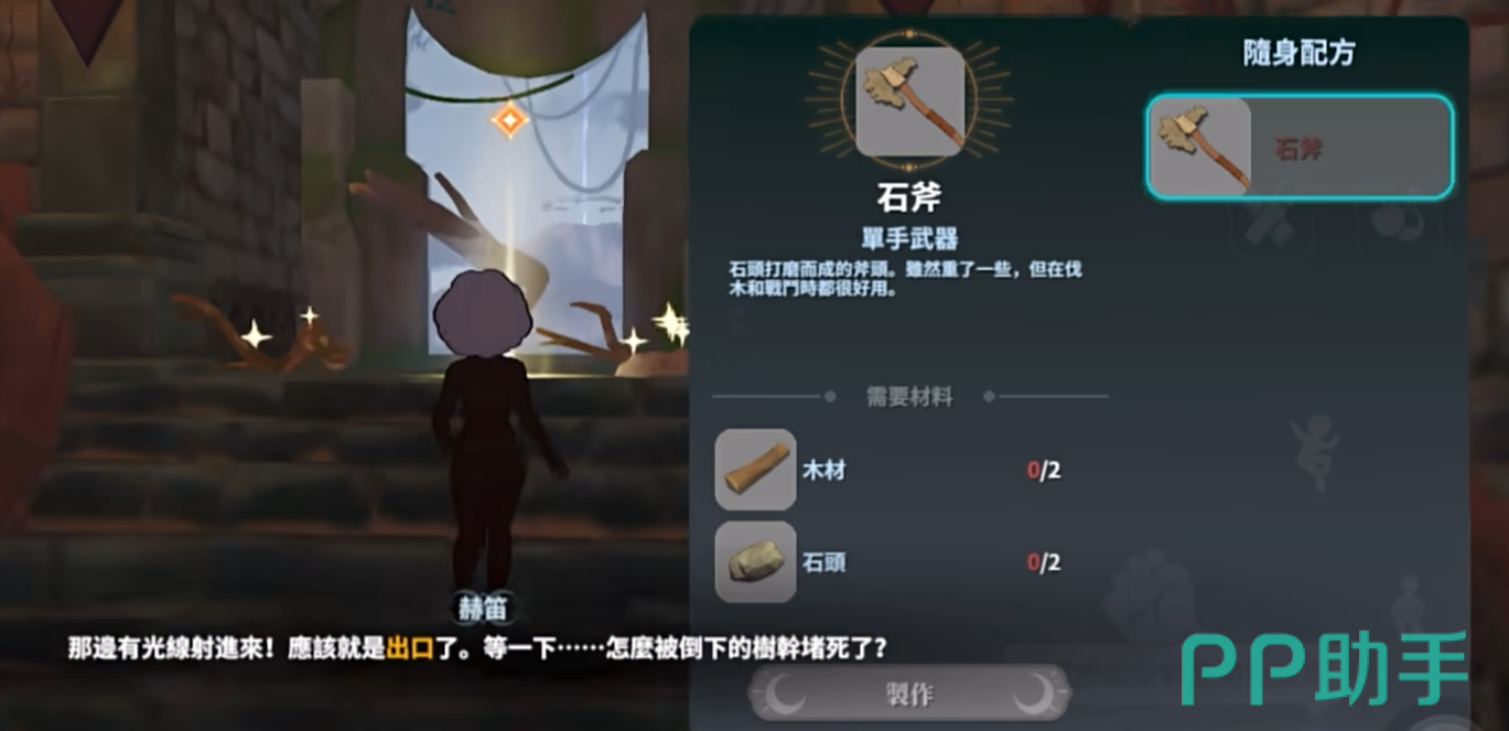 游戏开局即自动解锁“石斧”制作蓝图,无需额外探索或任务触发。材料获取路径极为便捷:首先进入出生点附近区域,采集2份木材;随后向地图外围移动,拾取2块普通石头;最后打开随身制作台界面,选择对应配方并确认合成,即可获得这把单手近战武器。该装备为前期清剿低等级野怪、采集资源的核心工具,操作门槛低、实用性高。