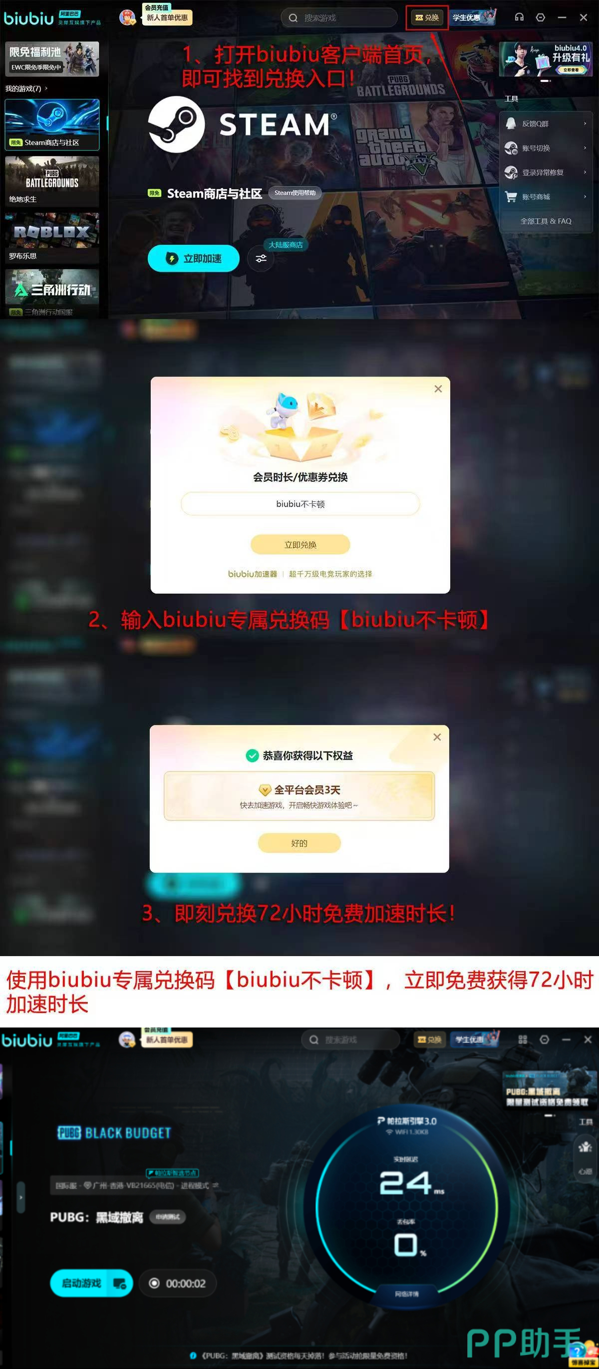 值得关注的是,biubiu当前正开放限时福利活动,用户完成指定任务即可参与测试资格抽奖。为降低体验门槛,新注册用户可直接领取24小时专属加速权益;输入口令【biubiu不卡顿】还可额外获得72小时加速时长,总计享96小时高速下载支持。