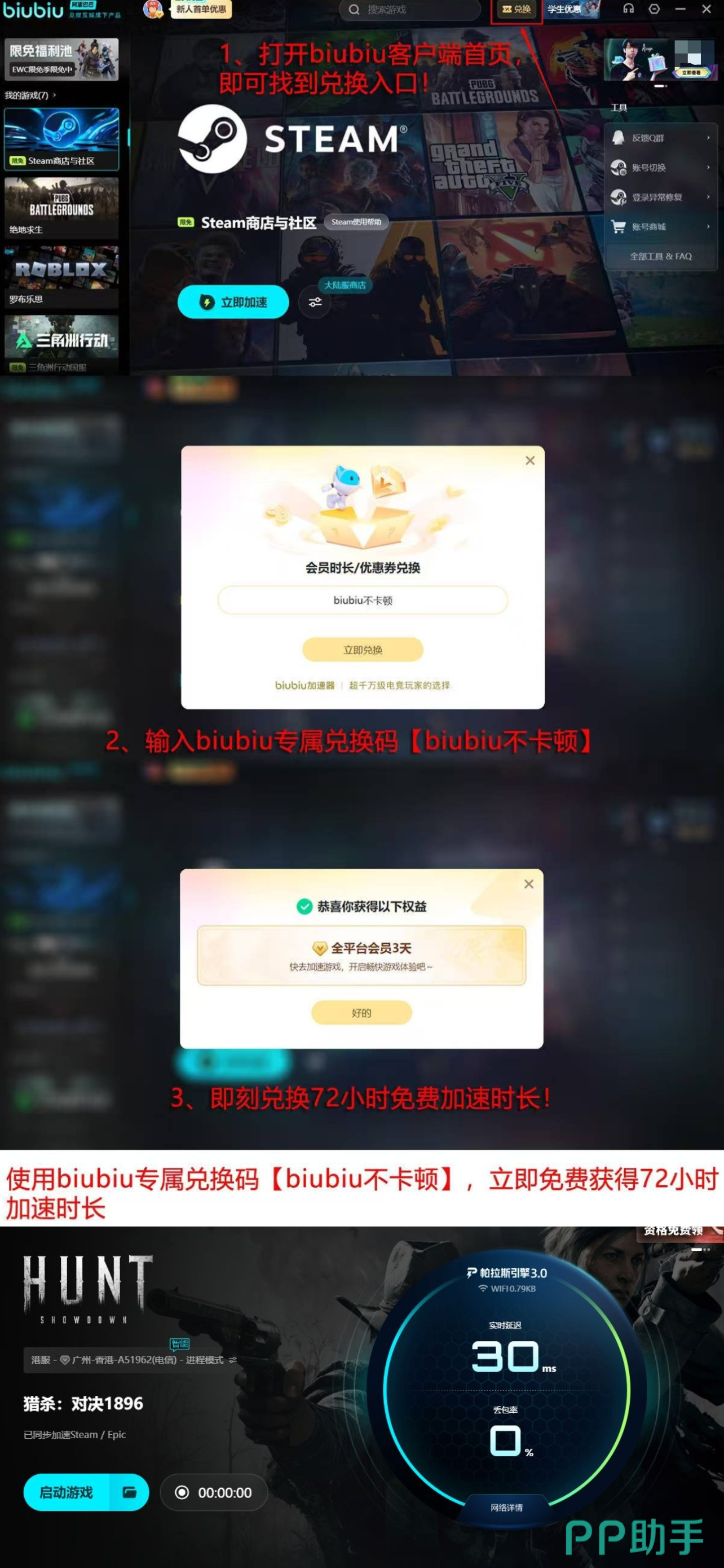 新用户注册后即可获得24小时全功能试用权限,首次登录即自动激活;所有用户还可额外领取3天高级服务体验时长,领取方式为在指定活动页面输入兑换码【biubiu不卡顿】完成激活。