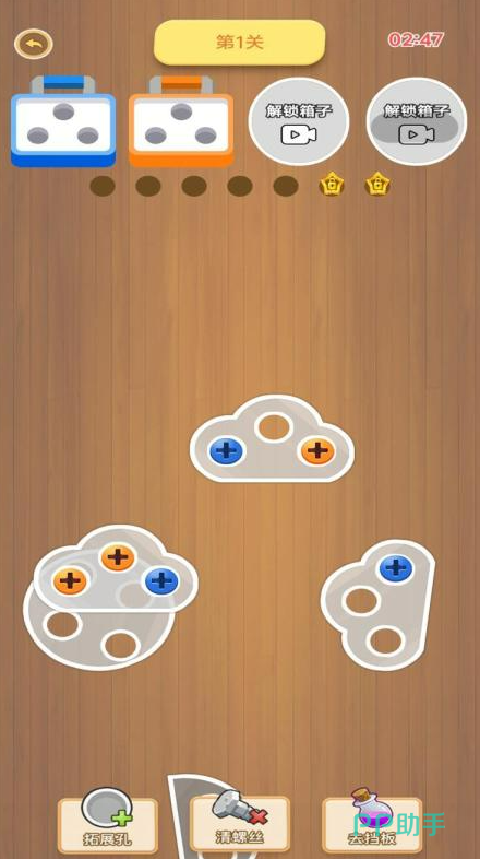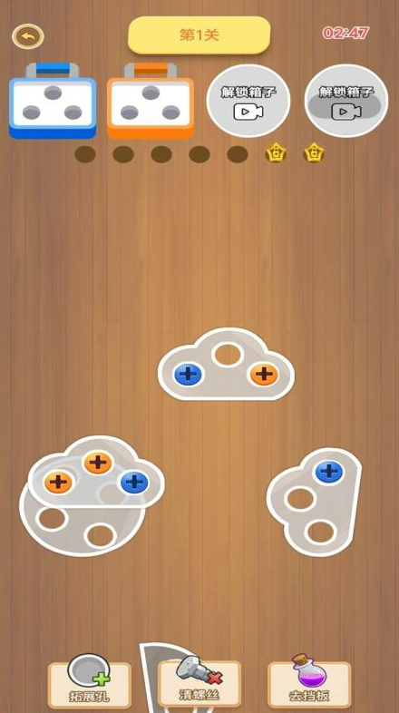 玩法就是把同一个颜色的螺丝钉取出来消除掉,三个凑一起就行。但是格子有限制,要是放了太多不同颜色的螺丝就输了。看着简单做起来得动脑子,因为螺丝摆放的位置有遮挡,得想清楚先取哪个后取哪个。颜色对不上的时候可以先放到空格子里等着,等出现合适的容器再移过去。关卡多了难度会慢慢增加,时间限制让人玩起来还挺紧张的,操作上并不难。