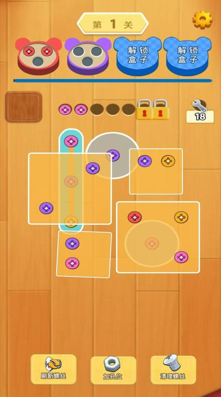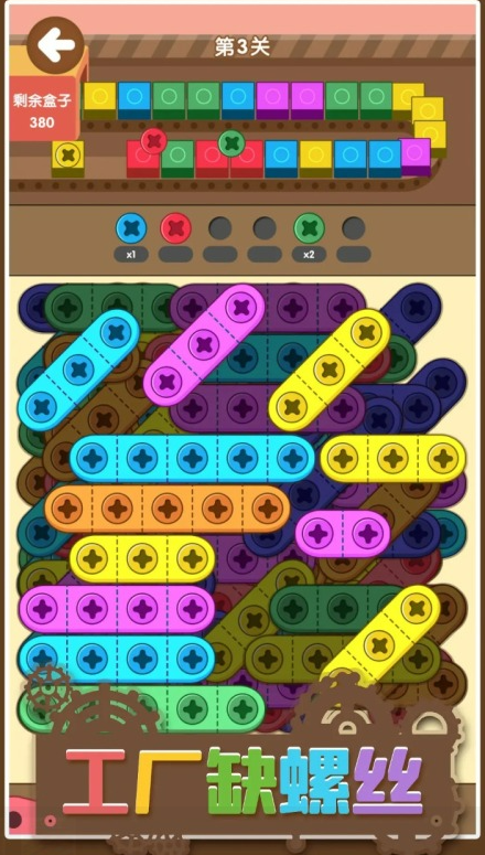 面板上有一堆螺丝,玩家需要把它们按颜色分类收好。拆下来放到卡槽里,凑够三个同色的就消掉了。关卡到了后面,颜色会越来越多,摆放位置也乱七八糟的,就得先思考一下动哪个。卡槽不够用的时候可以加孔位,或者把螺丝重新刷一遍。画面花花绿绿的,盒子和螺丝颜色对比很强烈,配的音乐听着令人放松。