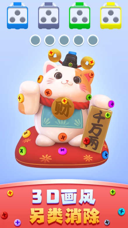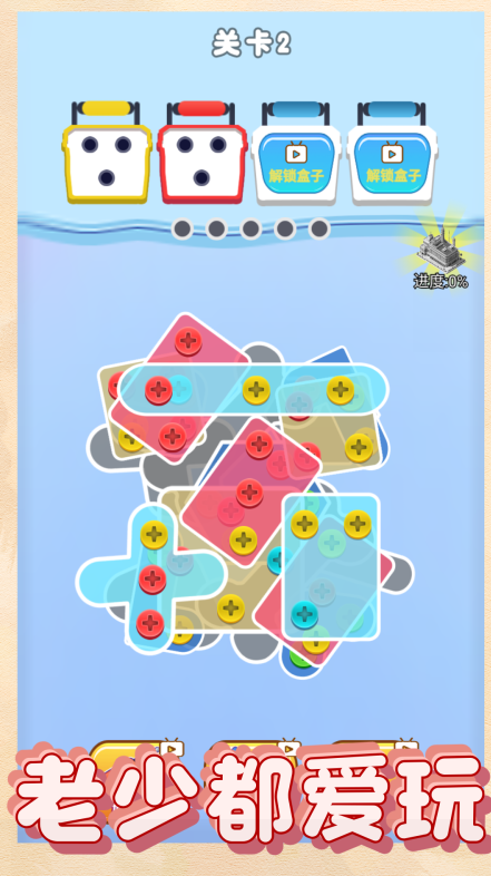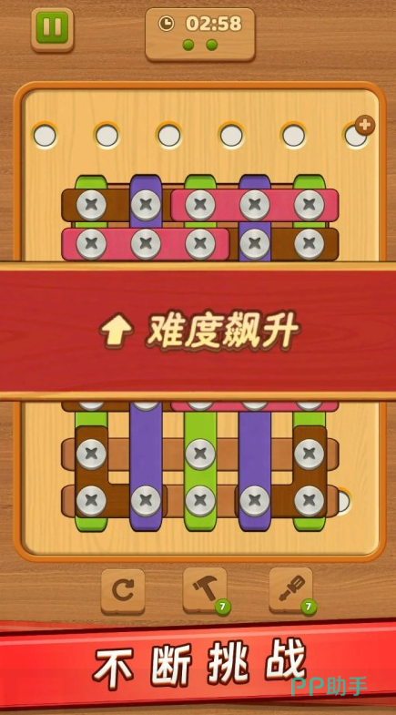 拔出来的螺丝要进行配对,三个一样颜色的就能消掉,进度条填满就算过关了。关卡挺多的,有200多个,玩法也有变化,有限时的也有带障碍的,越往后越考验脑子。道具也不少,炸弹能炸一片螺丝,彩虹螺丝能当万能的用,卡关的时候挺有用。画面是那种扁平化风格,颜色看着挺清爽,背景音乐轻快,消除的时候音效还很清爽。