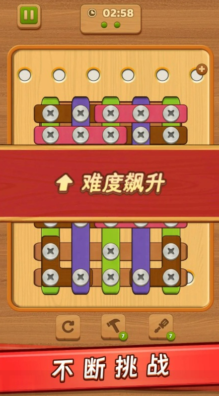 板子上钉着很多木条,螺丝钉要一个个拧下来。看着简单但挺费脑子,螺丝钉位置摆得有讲究,拧错顺序后面就卡住了。游戏里的木条会掉下来,有时候正好把空出来的螺丝孔挡住,所以得提前想好。关卡做得很不错,如果你运气好的话拧对一个能连着掉好几块木条,感觉还是挺解压的。不联网也能玩,什么时候想玩就玩。