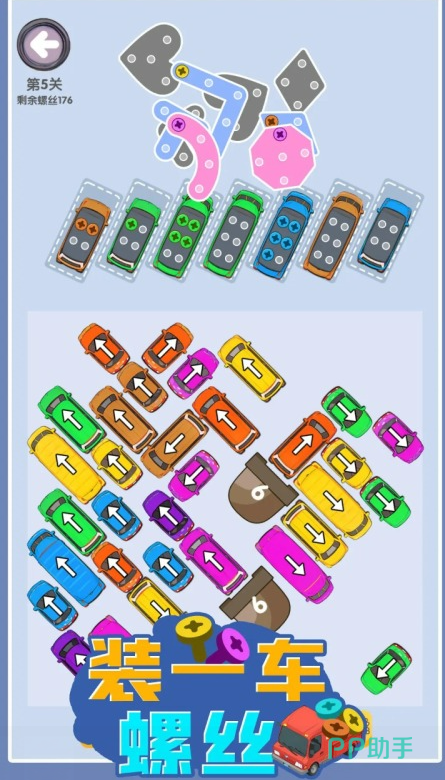 游戏里的螺丝要装车里,颜色必须对上。像红螺丝就配红车,蓝螺丝就配蓝车。颜色错了的话,关卡就过不去。关卡有一百多个,后面颜色种类变多之后,偶尔还会给些道具。只要点点手指车就会动,箭头会指引方向。螺丝飞进车里的过程还是很有趣的。停车跟收集的玩法混合在一起,小孩玩的话可以认识颜色,大人玩就可以用来消磨时间。