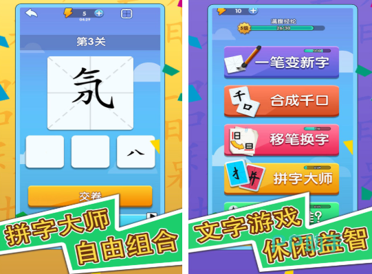 和汉字相关的一款游戏,里面包括拼音找茬,还有汉字组装等模式。需要把零散的偏旁拼成完整的汉字,还需要甄别汉字对应的错误拼音。玩法是贴合小学识字教学逻辑,从字形结构到拼音认读,就会形成完整的训练链条。操作只需要点击屏幕就可以完成,难度也会伴随着识字的数量慢慢的提升,可以精准的匹配不同年级的汉字基础。