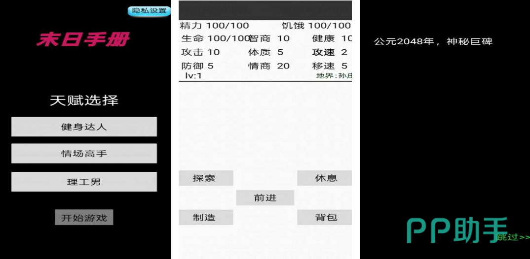这是一款纯文字类的末日生存手游,游戏有一定的难度,画面是那种极简风格,除了文字之外什么都没有,所以玩家们在游玩之时能够更加沉浸于游戏剧情,有更深刻的体验感。玩家们要做的就是时刻牢记自己的各项属性值,并且仔细阅读触发的各种事件和选择条件,再根据自己现有的装备条件来进行推理判断。玩家每一次的选择都会触发不同的事件,而且大部分的选择关卡只有选择正确才能存活,快去试一试!